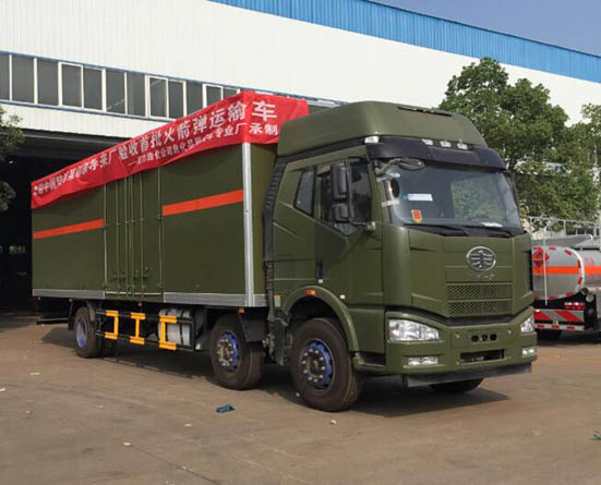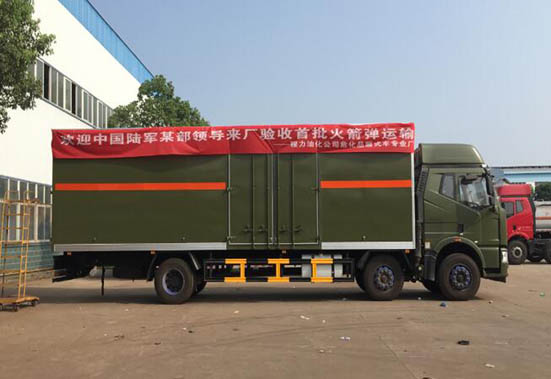 程力油化公司?;穾杰噺S第一單為部隊火箭彈專用運輸車,此車目前已經(jīng)軍隊某部驗收合格,正式投入使用。以下為產(chǎn)品展示圖: